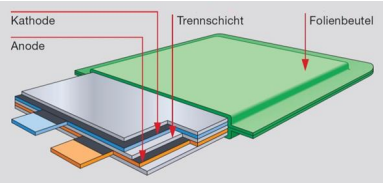 Diese Schichten sind in dünnen Lagen aufgerollt oder gefaltet („Pouch-Zelle“) und in einem Aluminium-Polymer-Beutel luftdicht verschweißt.