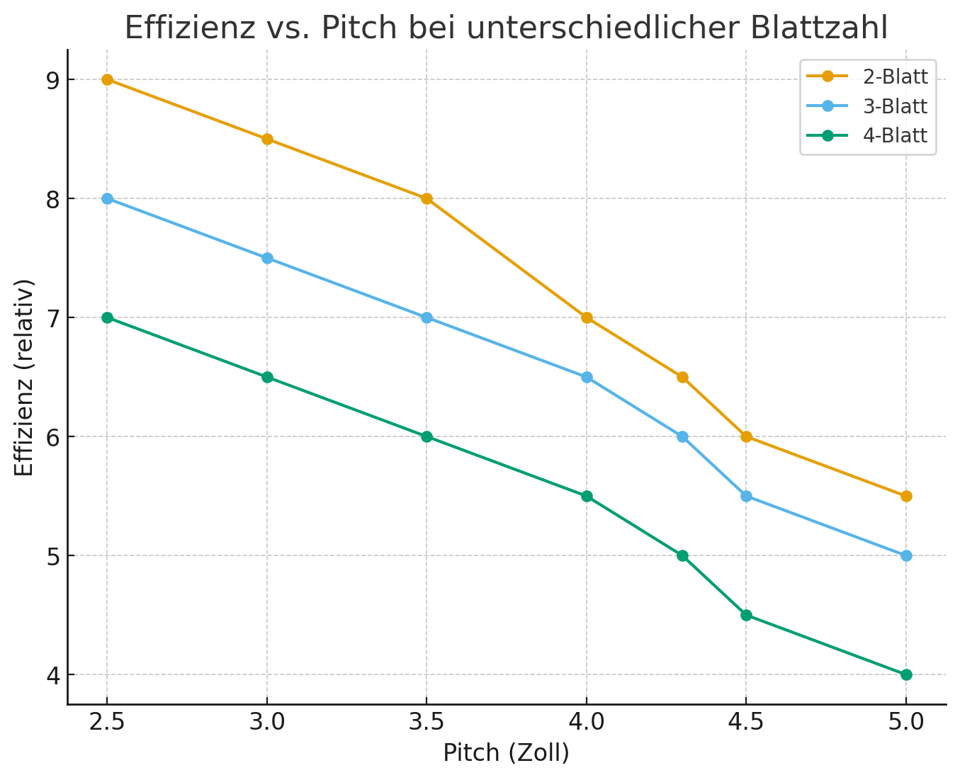 Je höher der Pitch und je mehr Blätter, desto ineffizienter (kürzere Flugzeit, heißere Motoren).